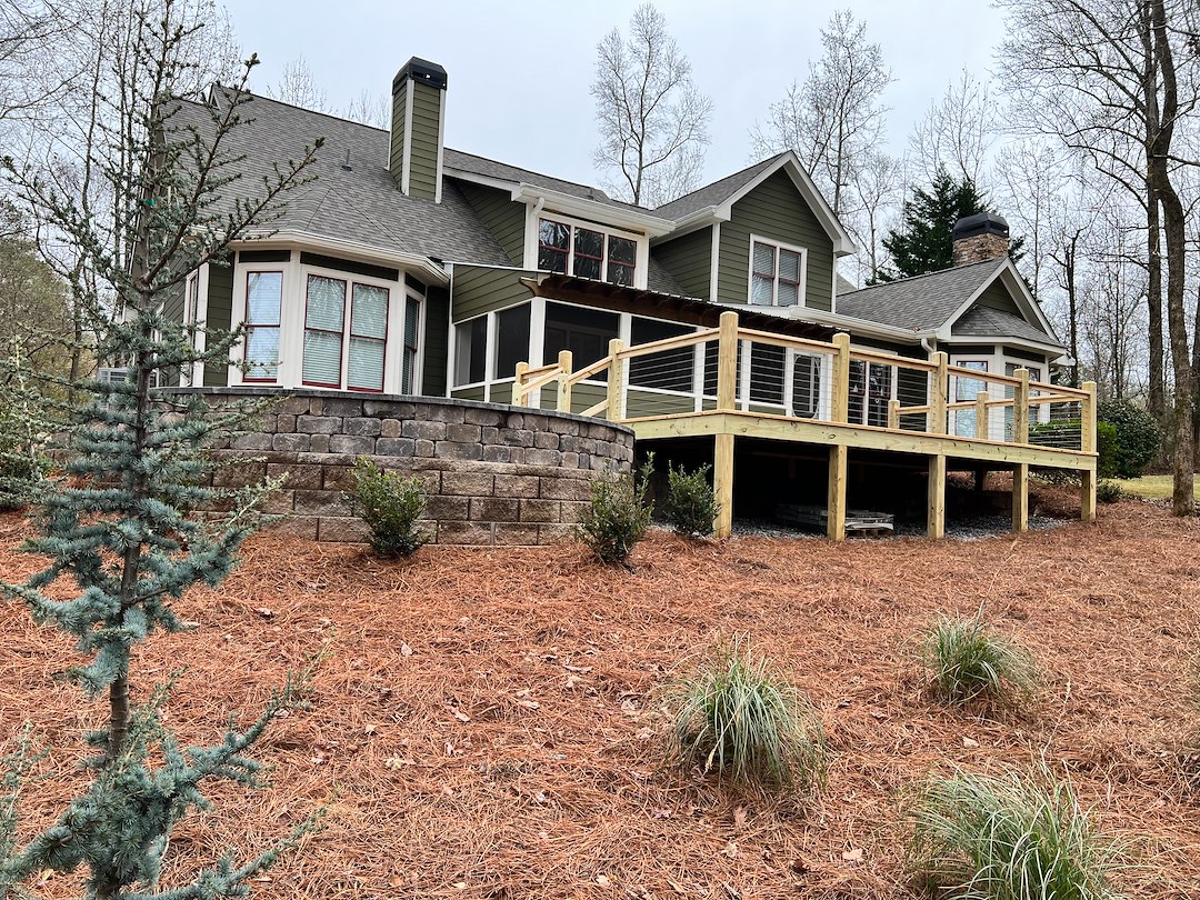 To complete the project, we added fresh landscaping around the retaining walls, patio, and deck to soften the hardscape and blend the space into the natural surroundings. New plantings, mulch, and finishing details brought the entire design together for a clean, polished look.